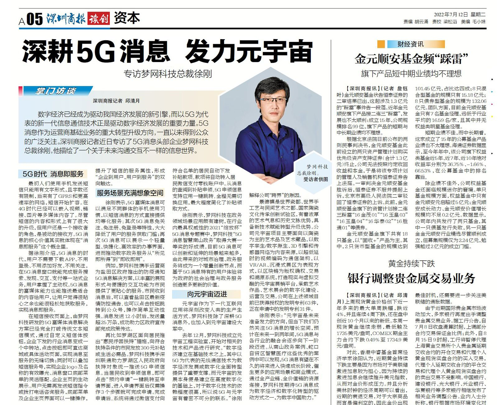 数字经济已经成为驱动我国经济开展的新引擎,而以5G为代表的新一代信息通信技术正是驱动数字经济开展的重要力量。5G消息作为运营商基础业务的重大转型升级的方向,不断以来得到公众的广泛关注。深圳商报记者近期专访了5G消息头部企业dcbox小金库app科技(002123)总裁徐刚,他描绘出了一个关于未来沟通交互不一样的信息世界。